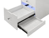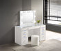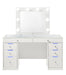 Step into a world of glamour with this sleek and chic vanity set, a perfect fusion of functionality and fashion. Its glossy finish and clean lines are complemented by the sparkle of crystal-like knobs, adding a touch of sophistication to your personal space. The spacious tabletop, graced with a large mirror surrounded by radiant lights, offers an ideal stage for beauty routines, ensuring flawless makeup application under impeccable lighting. With a variety of drawers, this vanity provides ample storage to keep essentials organized and within reach. Interior drawer lighting, integrated outlet, and hidden drawer storage are just some of the included features.