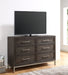 With a modern take on transitional styling, Broomfield is a study in simplicity with clean lines and an elegant mix of materials. This Dresser is sleek, yet warm and inviting with a warm walnut color finish that beautifully complements the champagne finished metal on bases and hardware. Picture frame drawer fronts add just the right amount of trim to accent the Dresser perfectly.