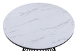 This dining set is a sophisticated blend of contemporary design and artistic flair, ideal for modern homes seeking a touch of elegance. The set features a sleek, round table with a faux marble top that is both beautiful and easy to care for. The table's base is a sculptural marvel, with a dynamic, cage-like structure that is as sturdy as it is stylish. Accompanying the table are plush chairs upholstered in a high-quality, textured fabric, their high backs and cushioned seats offering utmost comfort. The chairs' bold, black frames contrast with the light upholstery, adding a striking visual interest to the set.