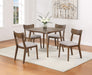 Bring mid-century charm to your dining space with this elegantly designed dining group, perfect for casual meals and stylish gatherings. The sleek, compact table features a warm woodgrain finish and softly rounded edges, creating a timeless look that blends seamlessly with any décor. Supported by tapered legs, it offers both stability and a refined aesthetic. The coordinating chairs showcase a sculpted backrest and plush upholstered seats, providing comfort while maintaining a clean, minimalist design. Ideal for small spaces or modern interiors, this set combines sophistication with everyday functionality, making it a beautiful and practical addition to any home.