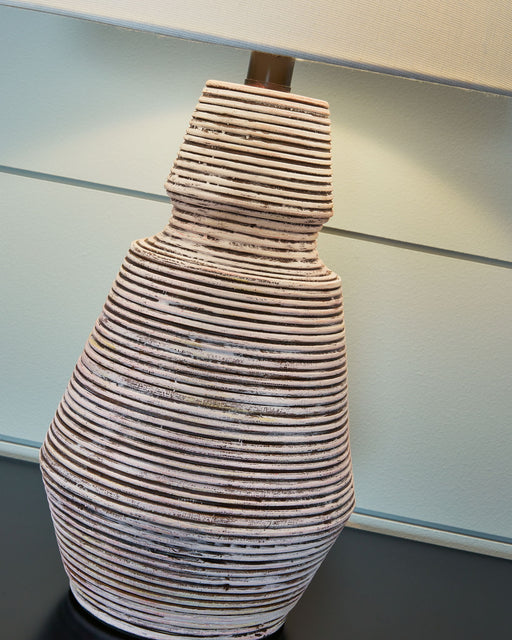 Signature Design by Ashley®This table lamp is a forward-thinking take on monochromatic design. An elongated base with a cinched profile gives this artistic piece the illusion...