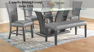 This sleek and modern dining group bridges form and function. The sculptural dining table has a sturdy base and the glass top allows views of the upholstered open shelf. Streamlined chairs and bench feature pewter finished wood and upholstery with a subtle glitter sheen.